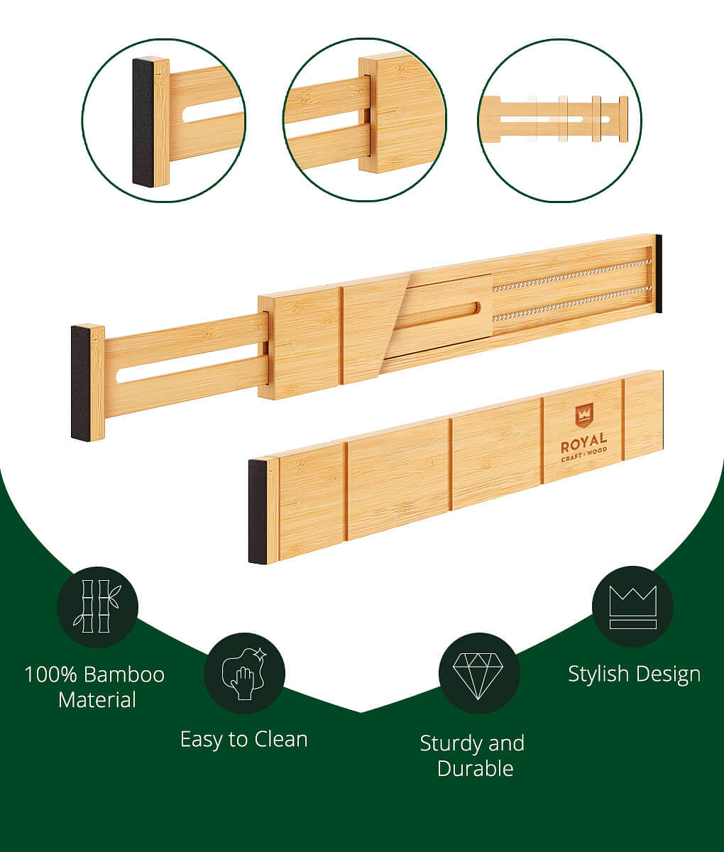 Bamboo Expandable Drawer Dividers – Adjustable Kitchen, Bedroom, Bathroom Organizer Set with Eco-Friendly Formaldehyde-Free Wood, Fits Drawers 17-22 Inches, Durable & Easy to Install, Free Shipping USA