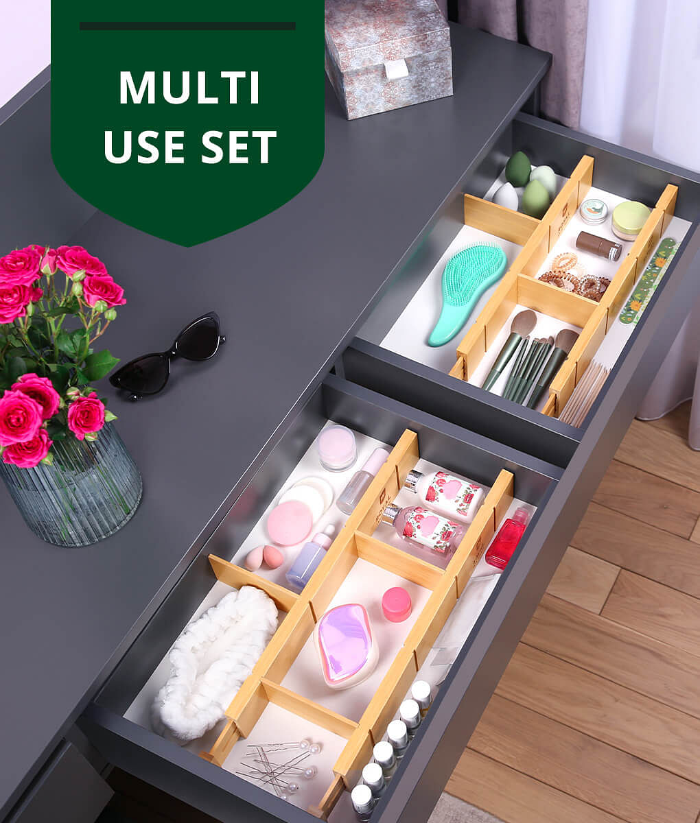 Experience the joy of a well-organized home with our highly durable drawer dividers that promise both function and form. Whether you’re organizing your kitchen utensils, managing bedroom essentials, or organizing your bathroom supplies, these dividers make everything easily accessible.